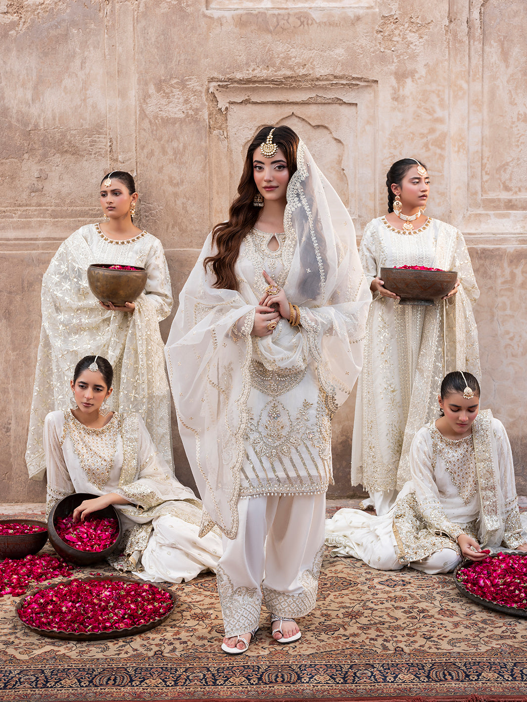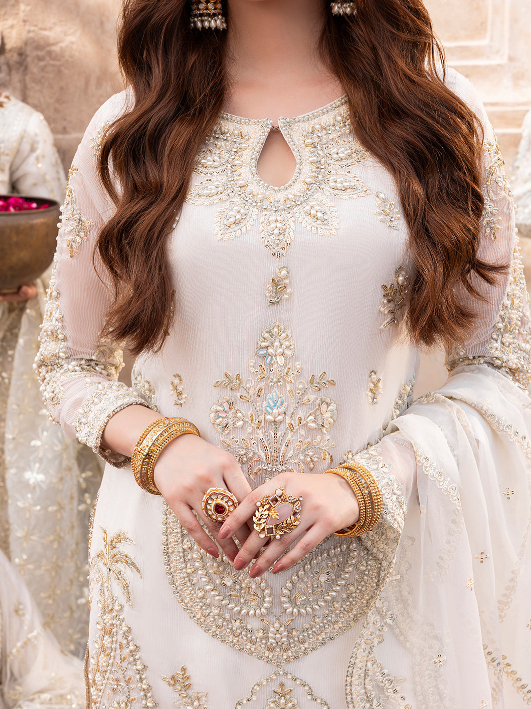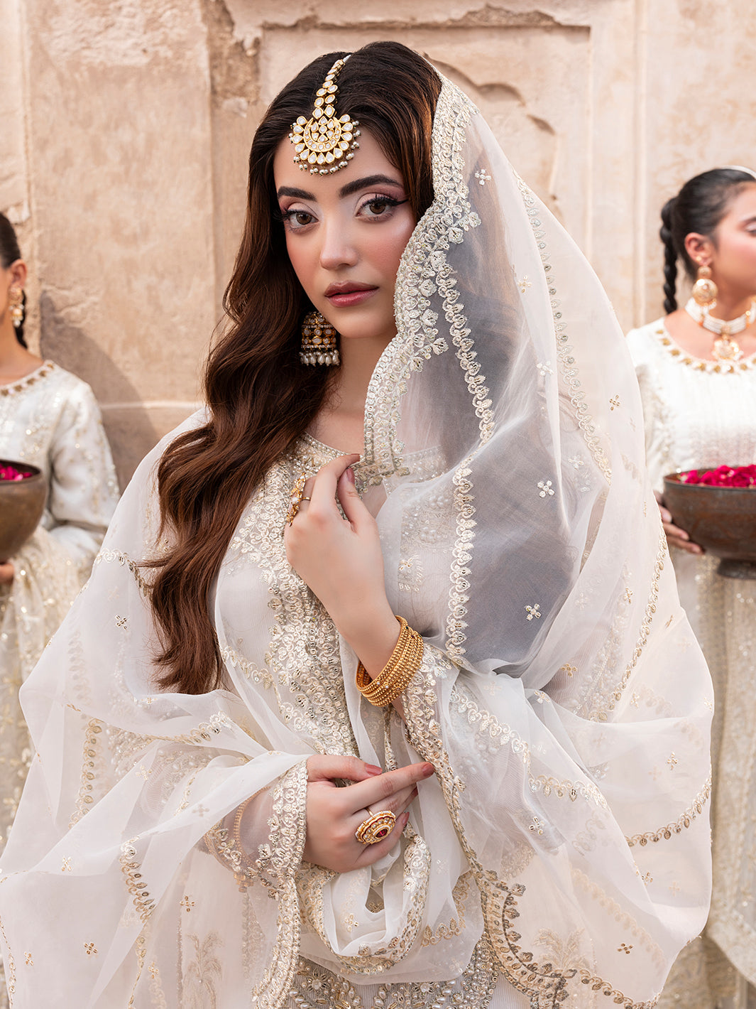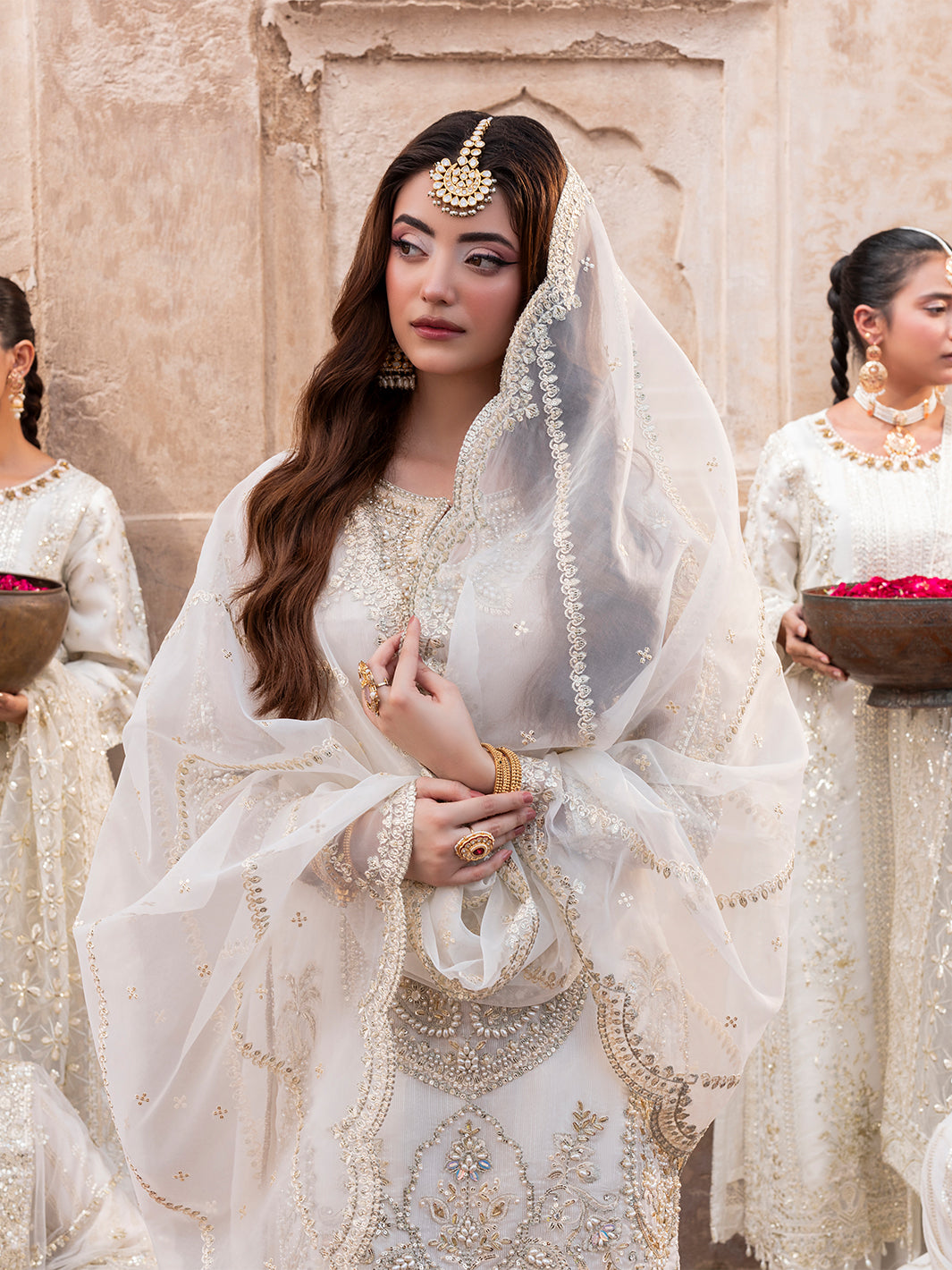The stunning white shirt with beautiful farshi shalwar modern elegance, featuring exquisite embroidery and gracefully drapped organza dupatta