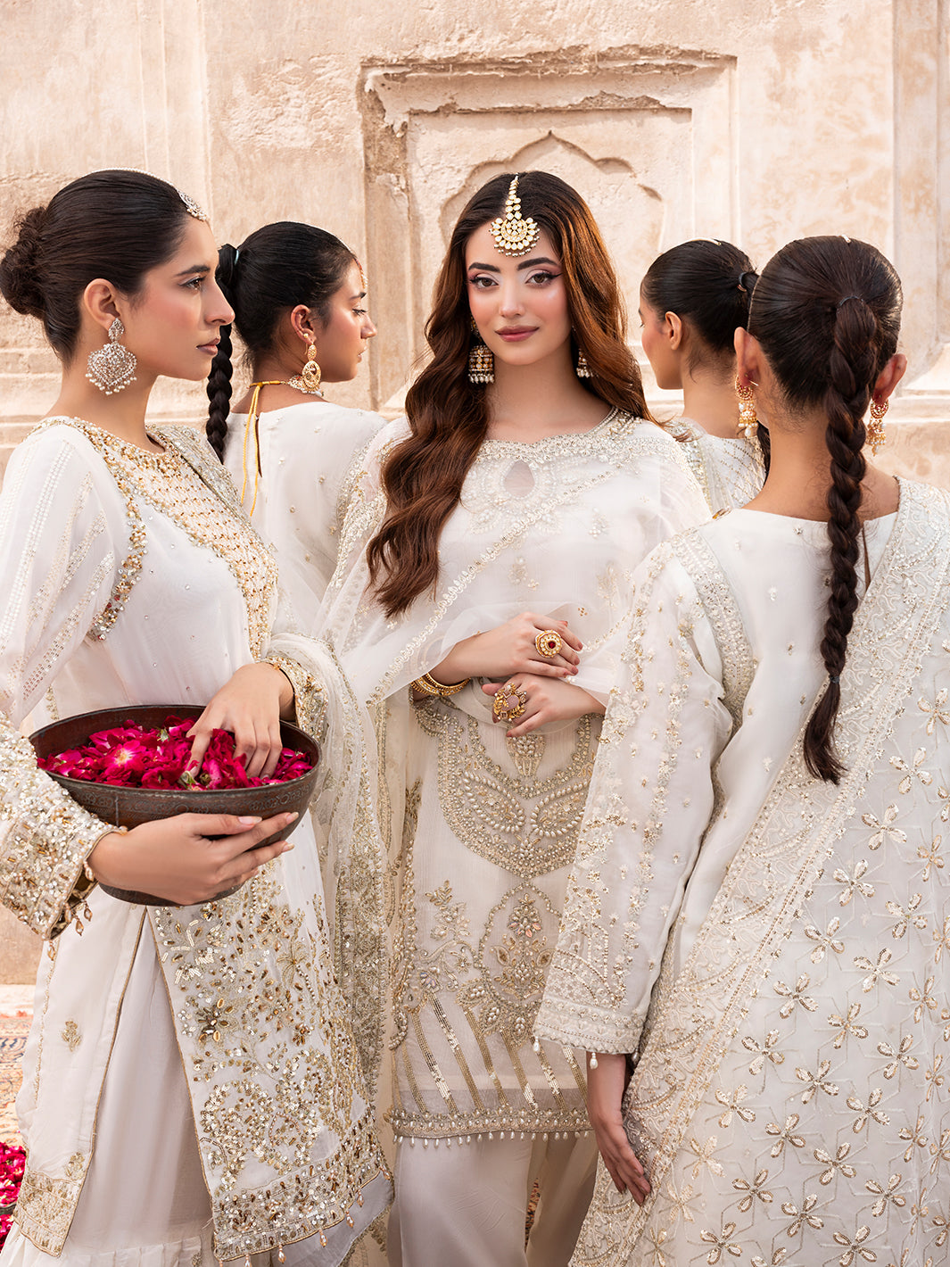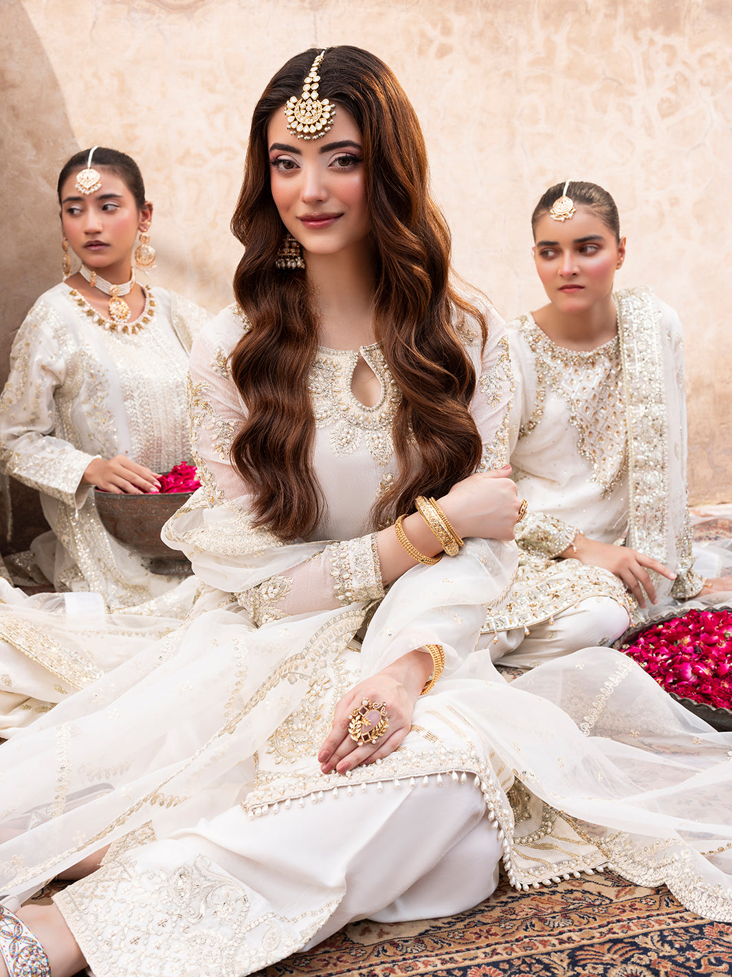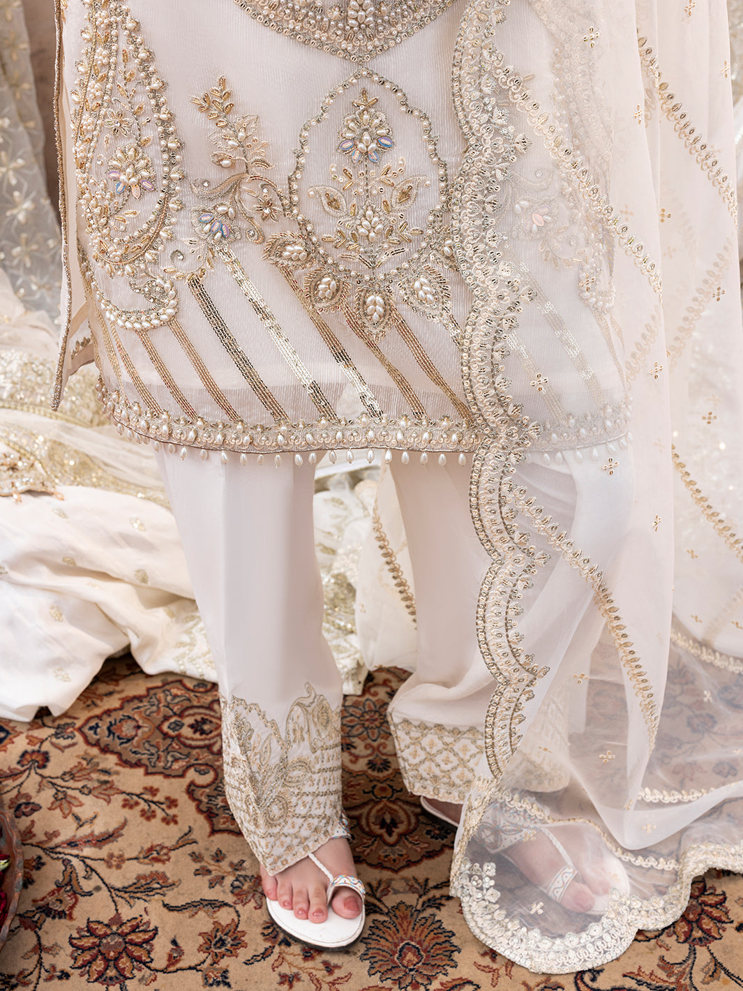 The stunning white shirt with beautiful farshi shalwar modern elegance, featuring exquisite embroidery and gracefully drapped organza dupatta