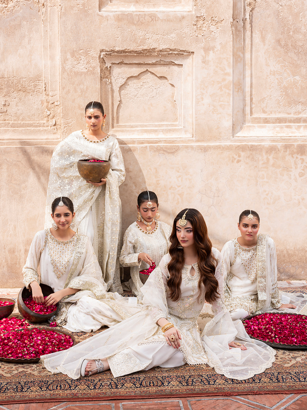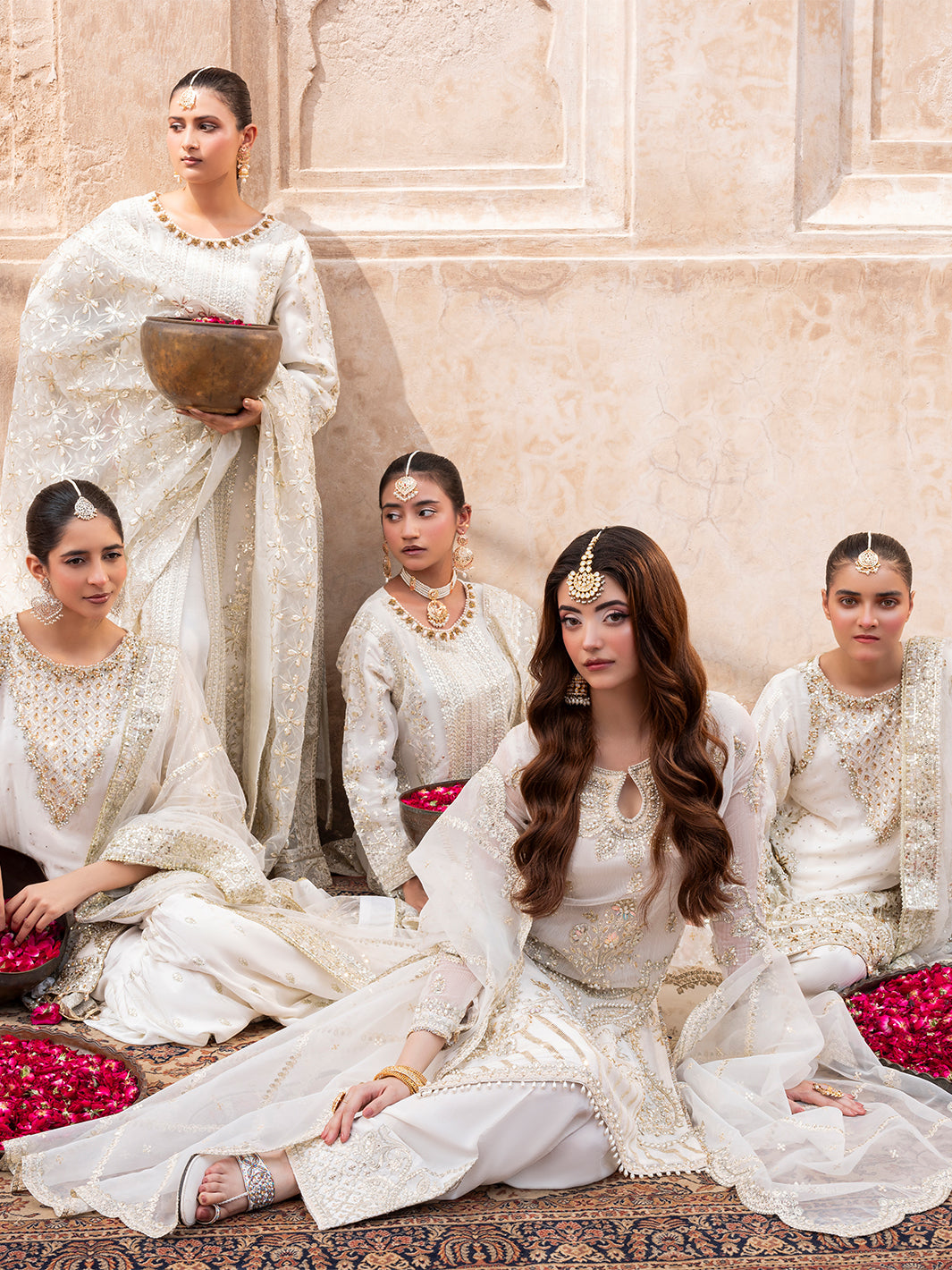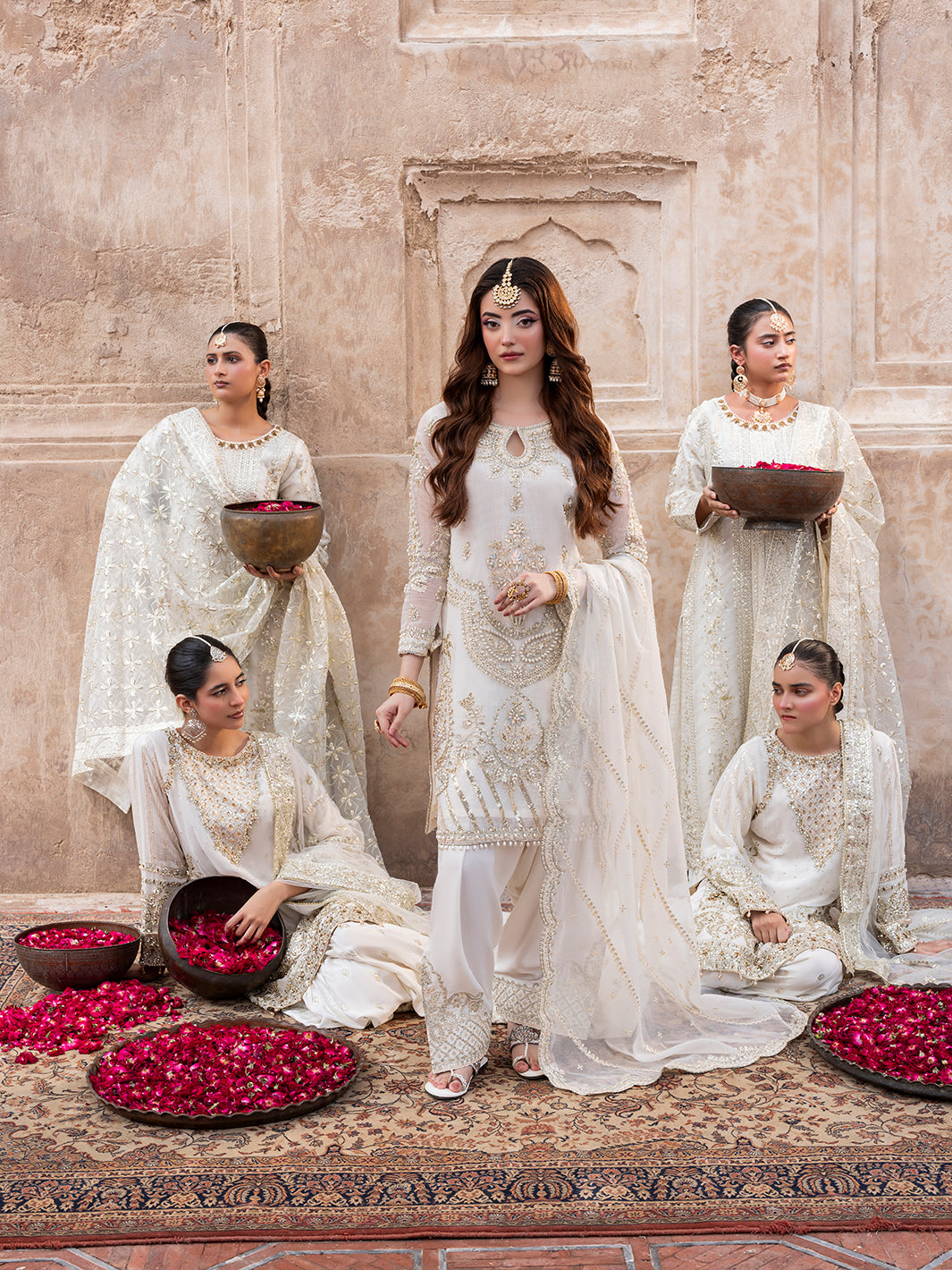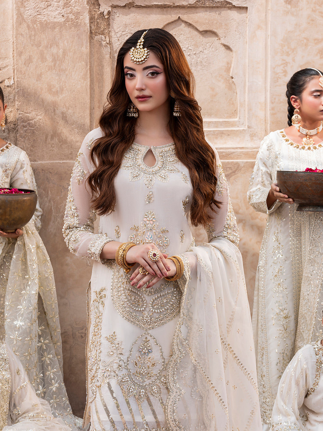 The stunning white shirt with beautiful farshi shalwar modern elegance, featuring exquisite embroidery and gracefully drapped organza dupatta