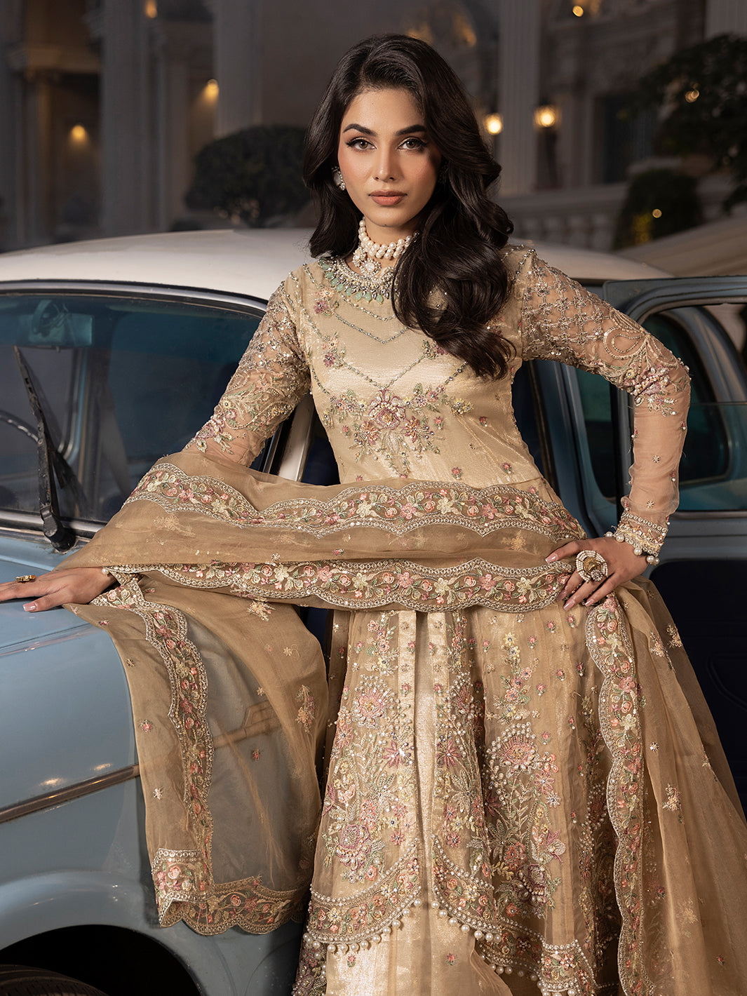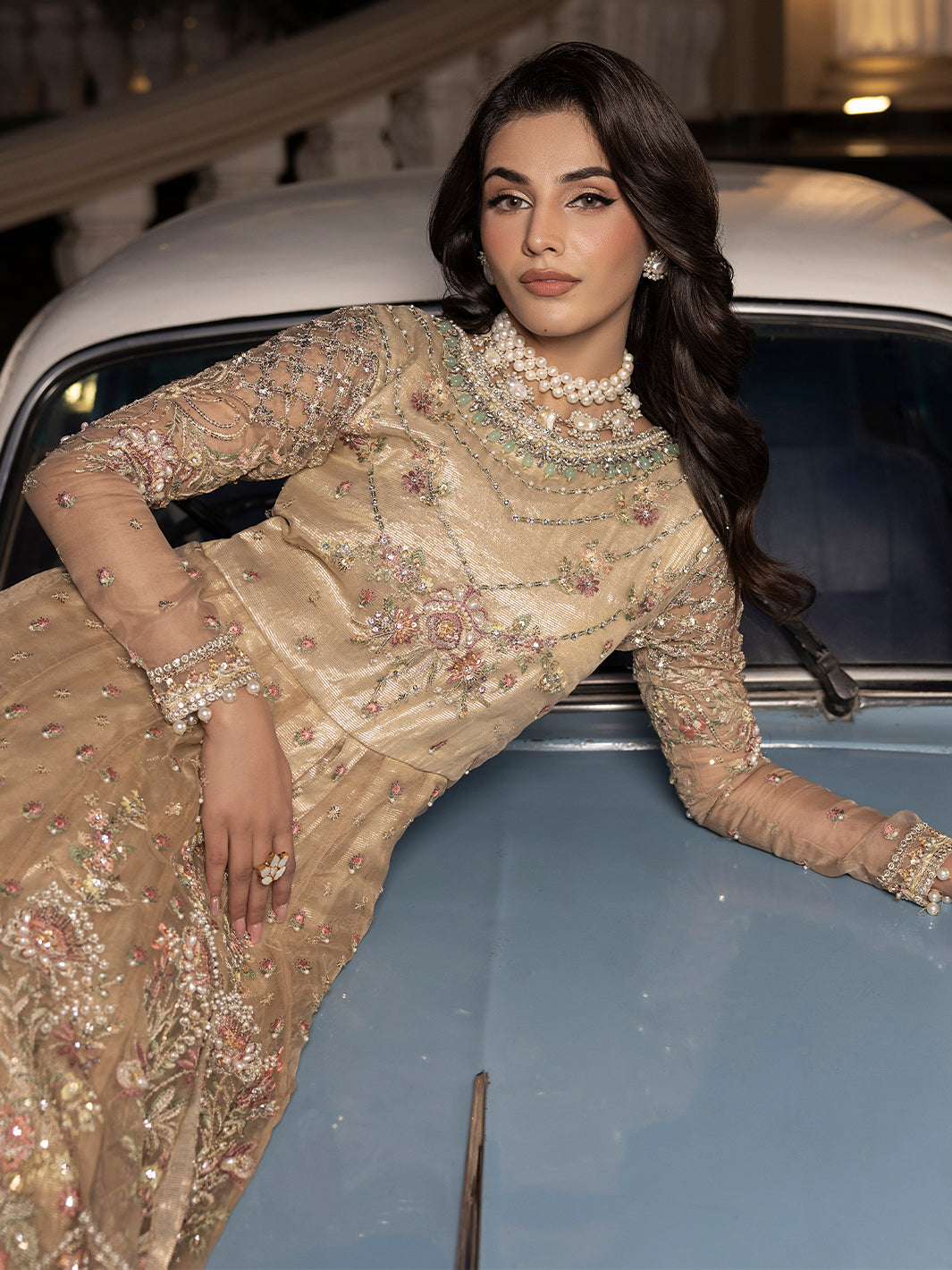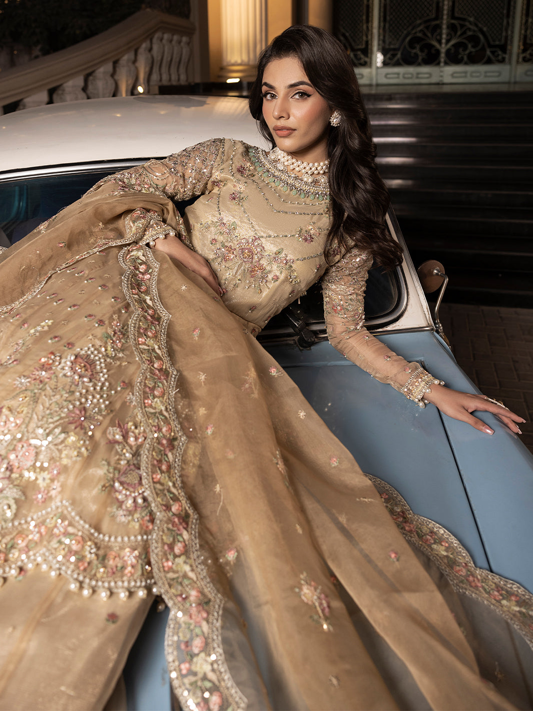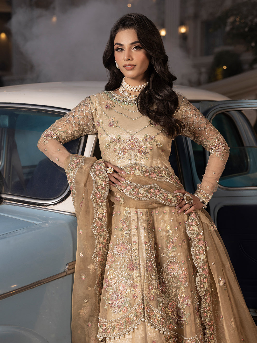 Dayaar e ishq is soft glow of dawn breaking over a serene horizon, this peach ensemble embodies a quiet yet captivating elegance. The stronglistens with light gold zari and sequins, resembling dewdrops catching the morning light.