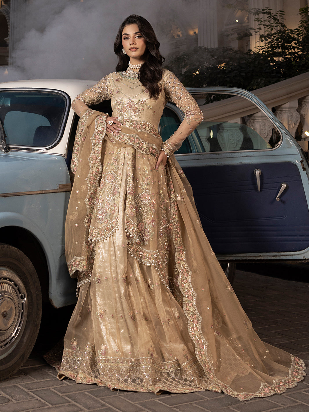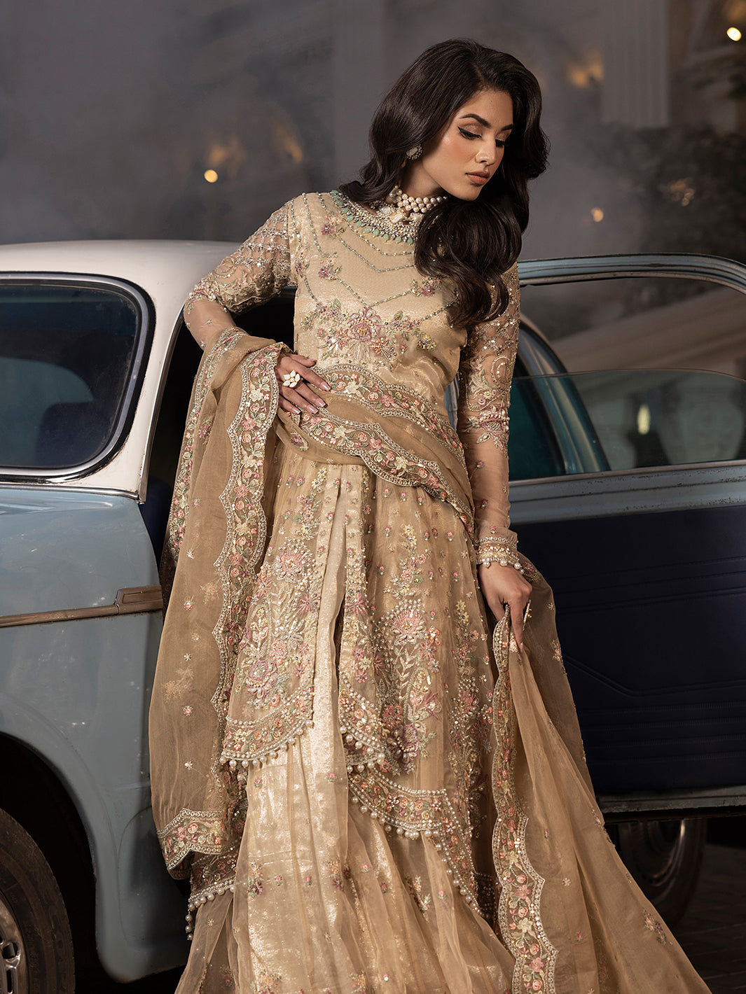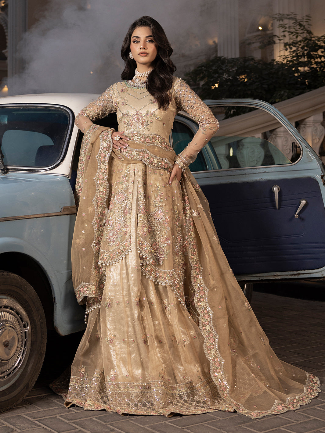 Dayaar e ishq is soft glow of dawn breaking over a serene horizon, this peach ensemble embodies a quiet yet captivating elegance. The stronglistens with light gold zari and sequins, resembling dewdrops catching the morning light.