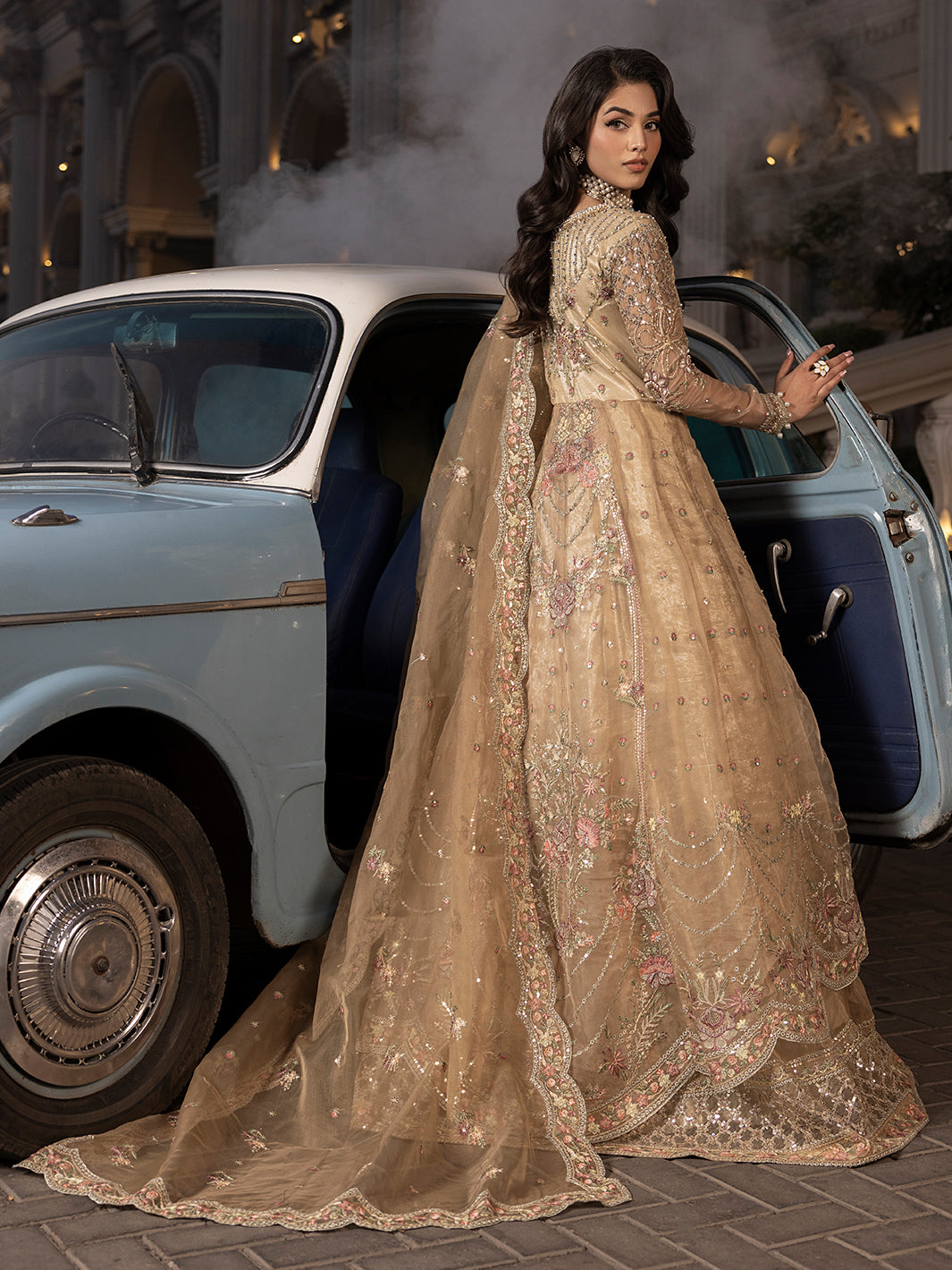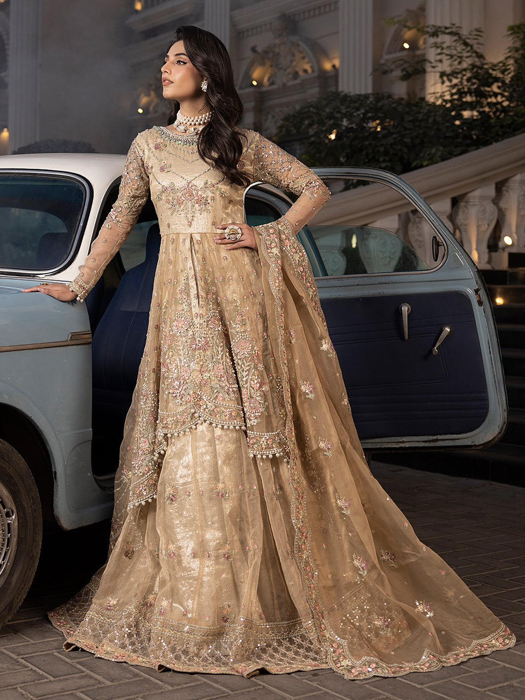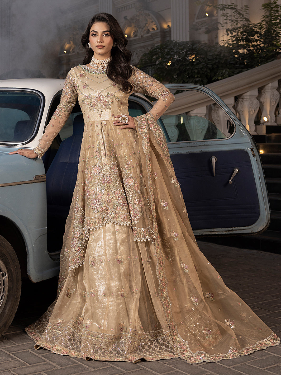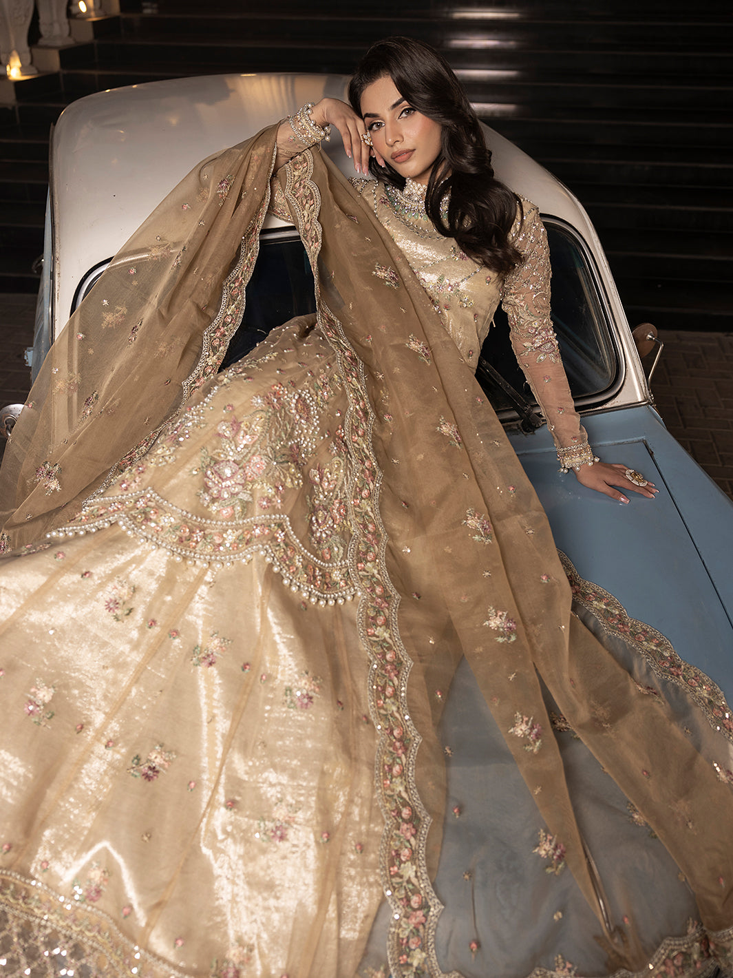 Dayaar e ishq is soft glow of dawn breaking over a serene horizon, this peach ensemble embodies a quiet yet captivating elegance. The stronglistens with light gold zari and sequins, resembling dewdrops catching the morning light.