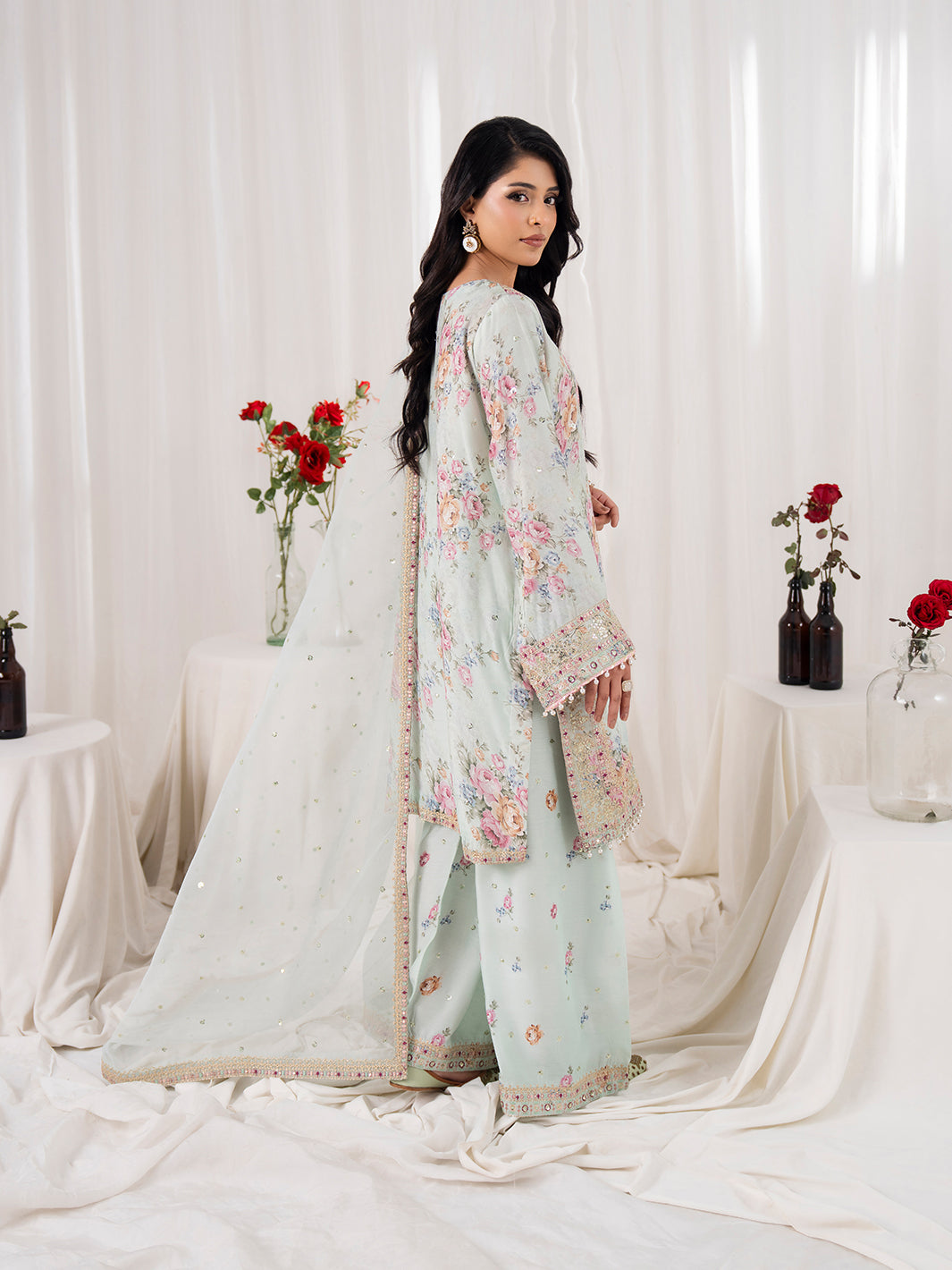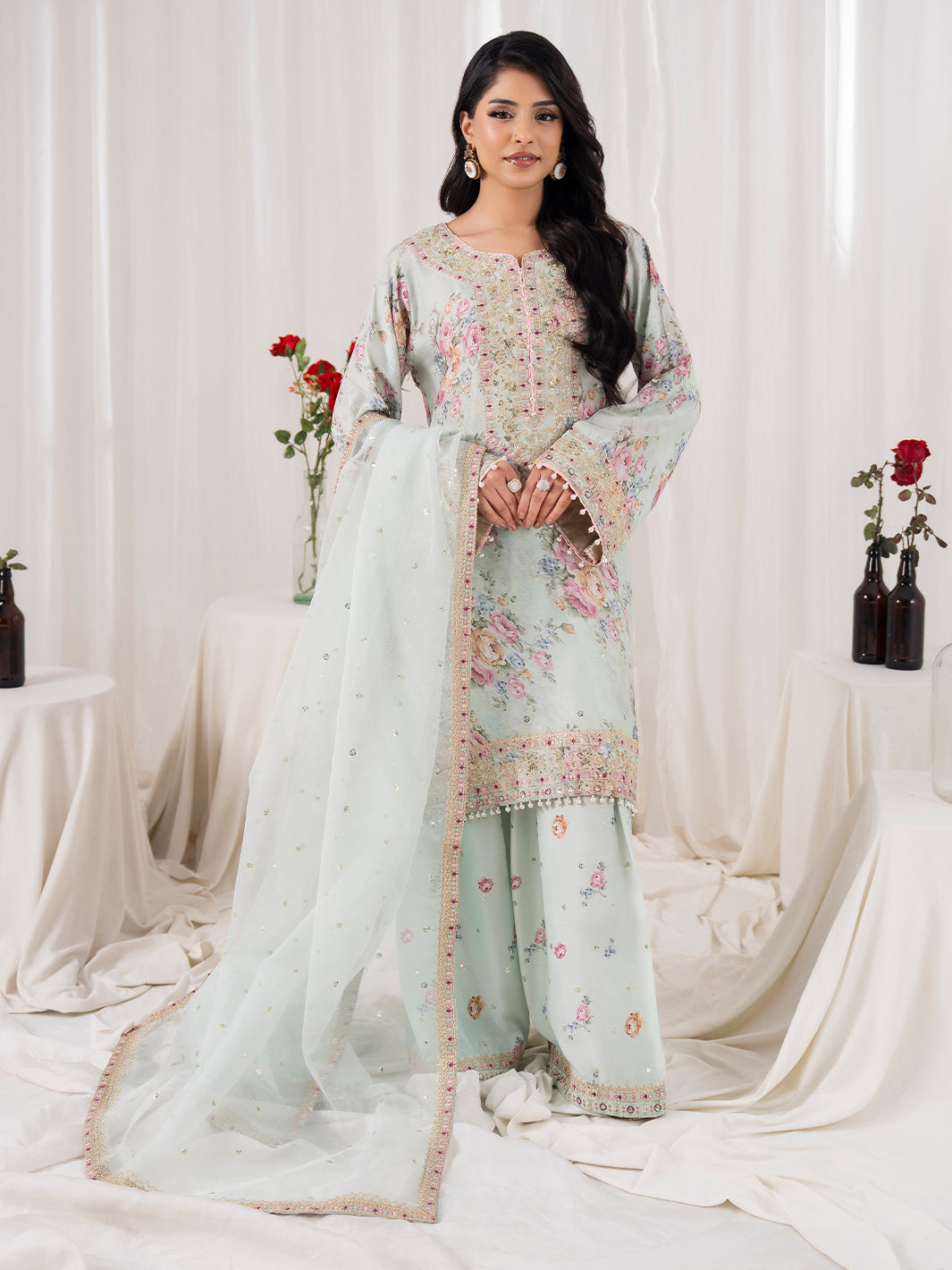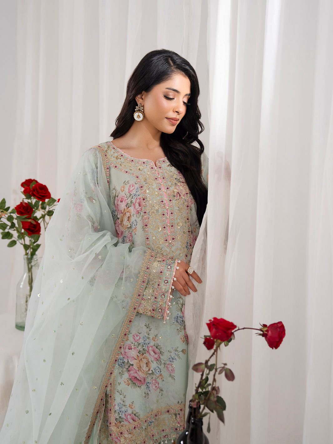 Dupatta fabric is organza with four sided embroidered border