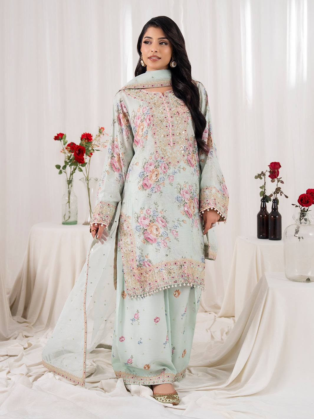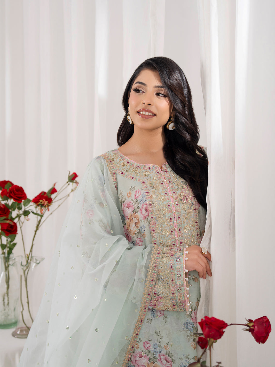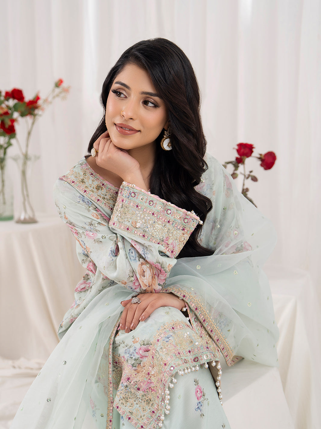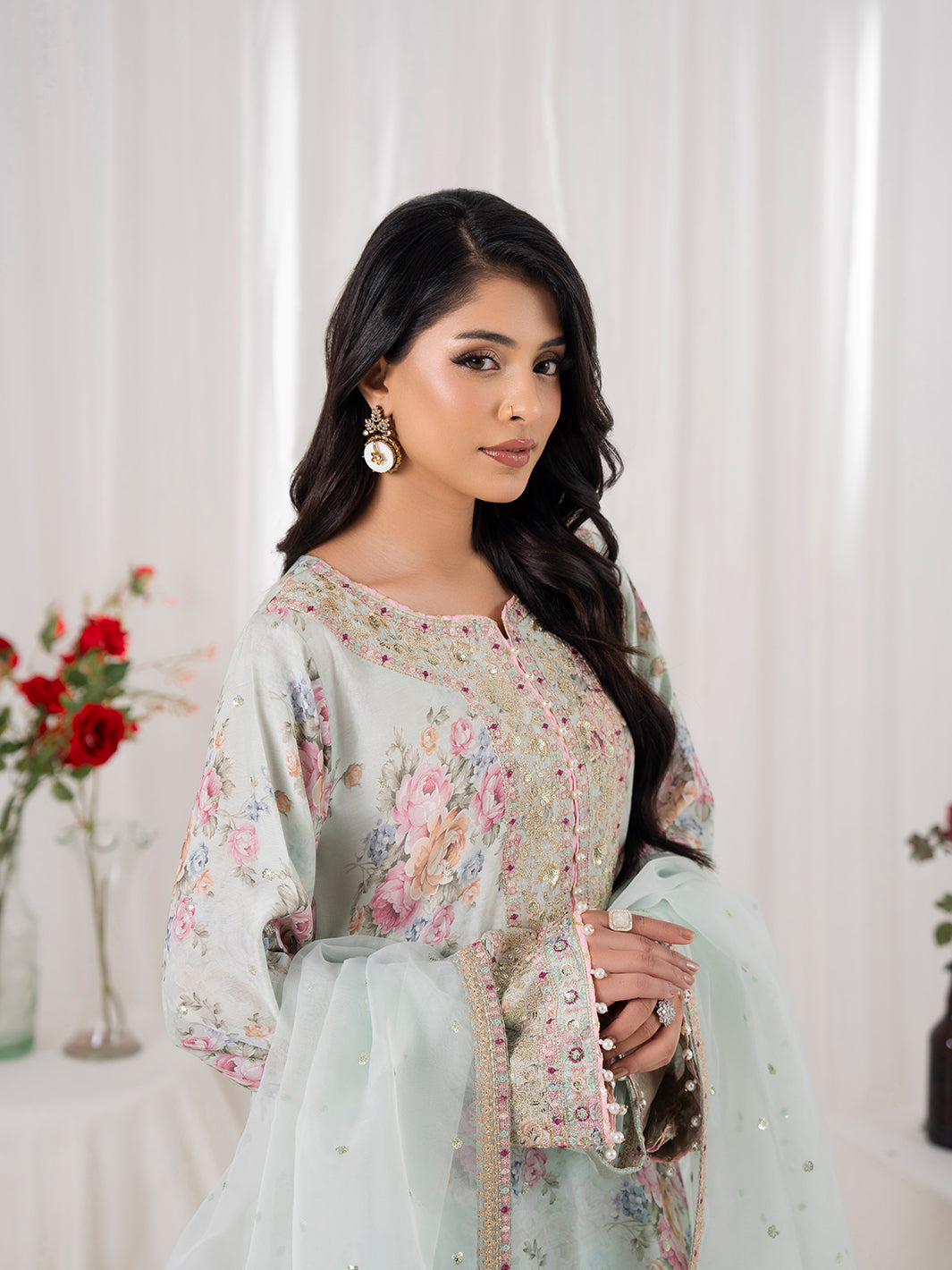 Dupatta fabric is organza with four sided embroidered border